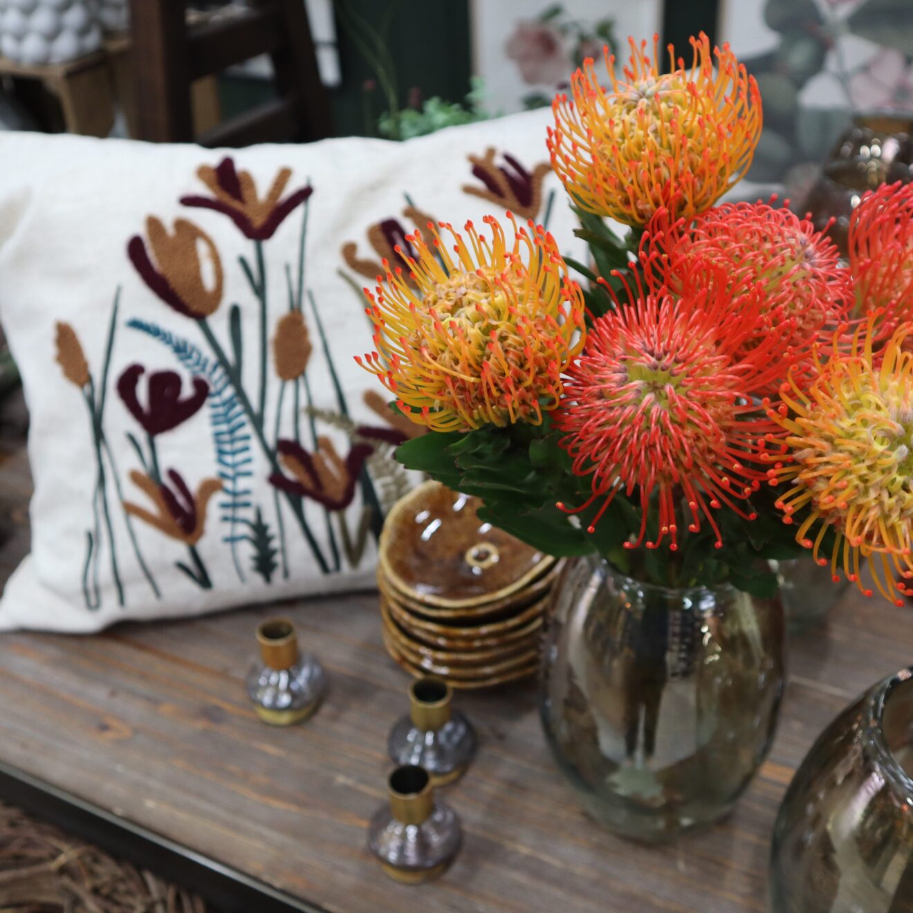 Se vårt handplockade sortiment av säsongens krukväxter, snittblommor, träd, buskar och perenner. I din blomsterbutik i Vetlanda hittar du alltid inredningsdetaljer, såsom keramik, krukor, textilier, ljuslyktor, lampor och mycket mer! Vi har även ett kompletterande urval av näringsrik jord, plantstarter, fröer och tillbehör, såsom mindre handverktyg och vattenkannor.