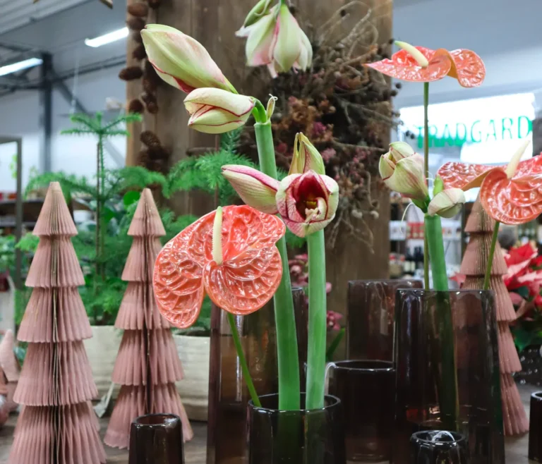 Vår butik är fylld med säsongens snittblommor, krukväxter och inspirerande inredningsnyheter. Dessutom har vi vårt 400 kvadratmeter stora växthus. I växthuset hittar du inspirerande nyheter för den kommande säsongen – allt från gröna bladväxter till blommande nyheter.