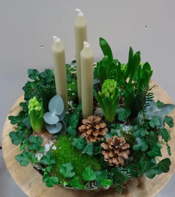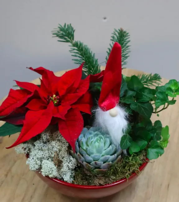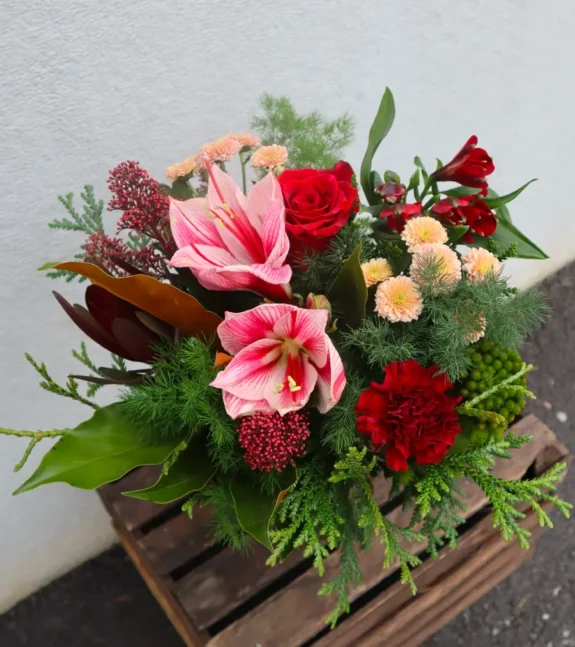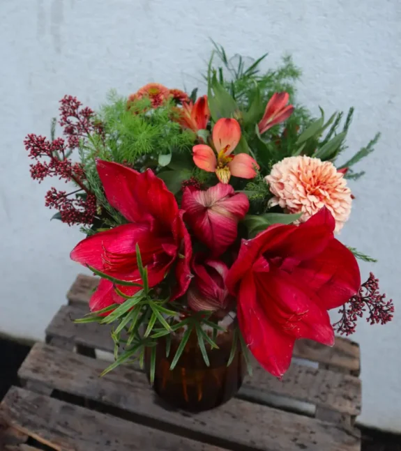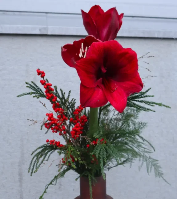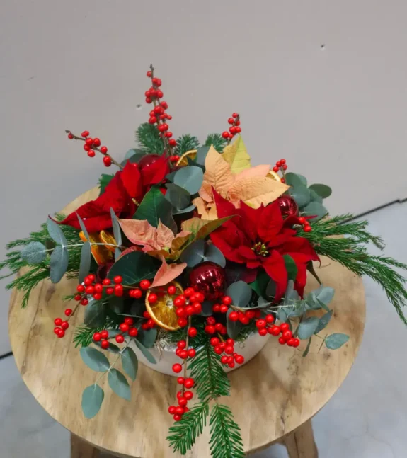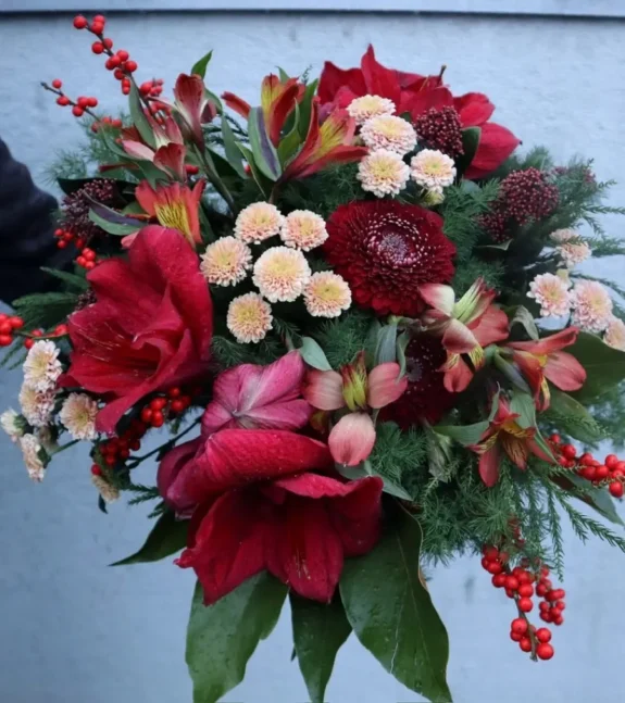 Floristen designar en maxad bukett med säsongens blommor i julens färger