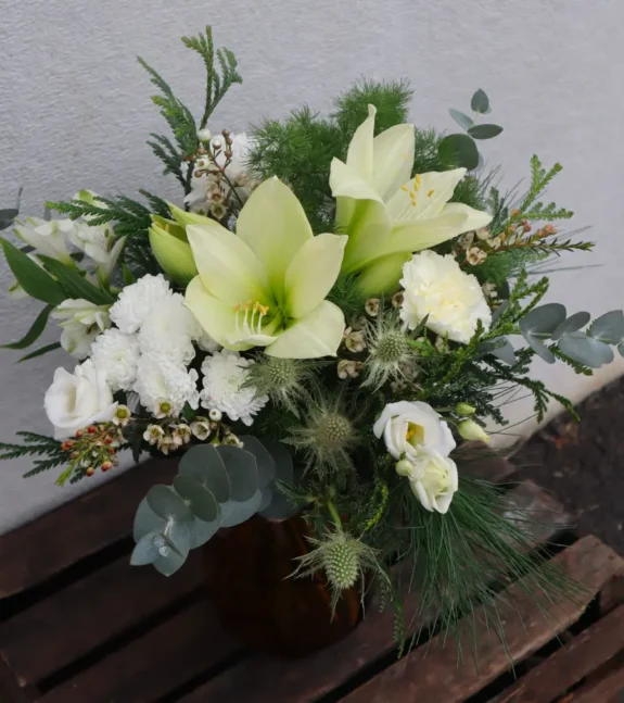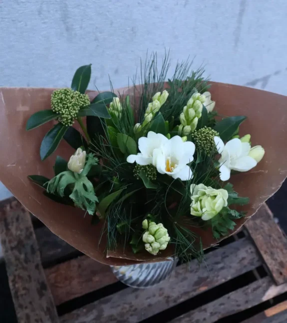 Floristen designar en vintrig bukett med säsongens blommor i vitt