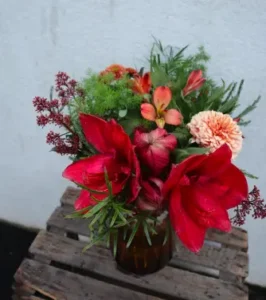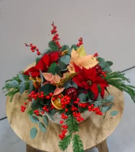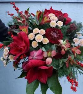 Floristen designar en maxad bukett med säsongens blommor i julens färger