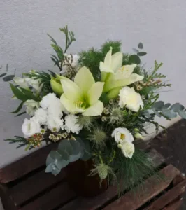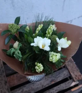 Floristen designar en vintrig bukett med säsongens blommor i vitt