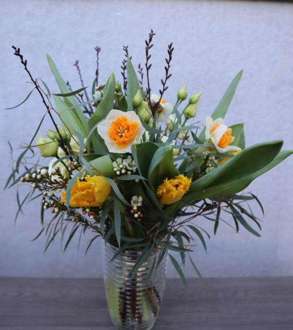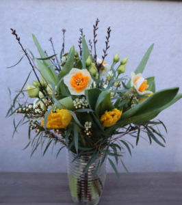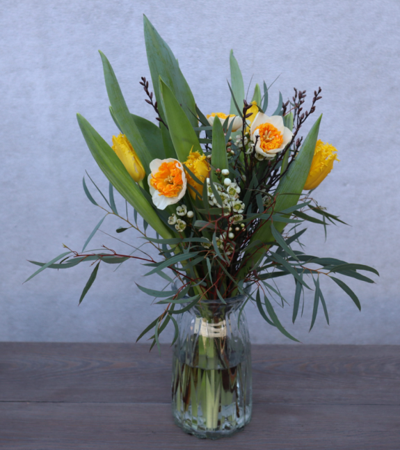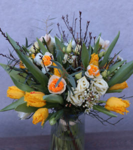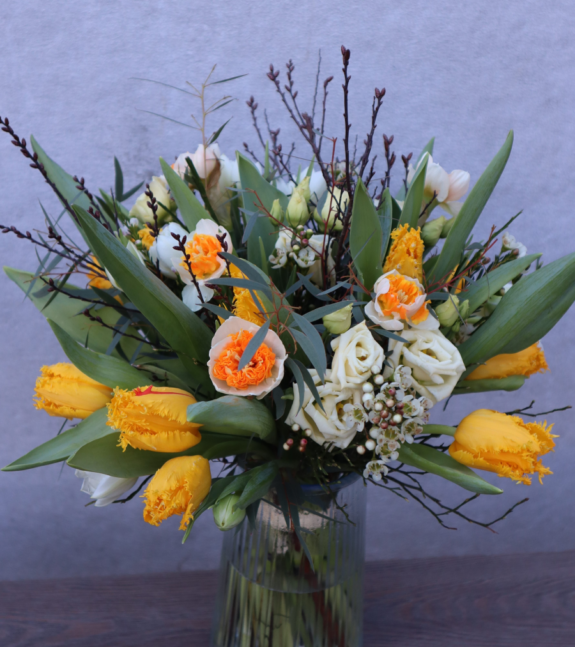 Floristen designar en fin tulpanbukett med säsongens blommor/gröna.