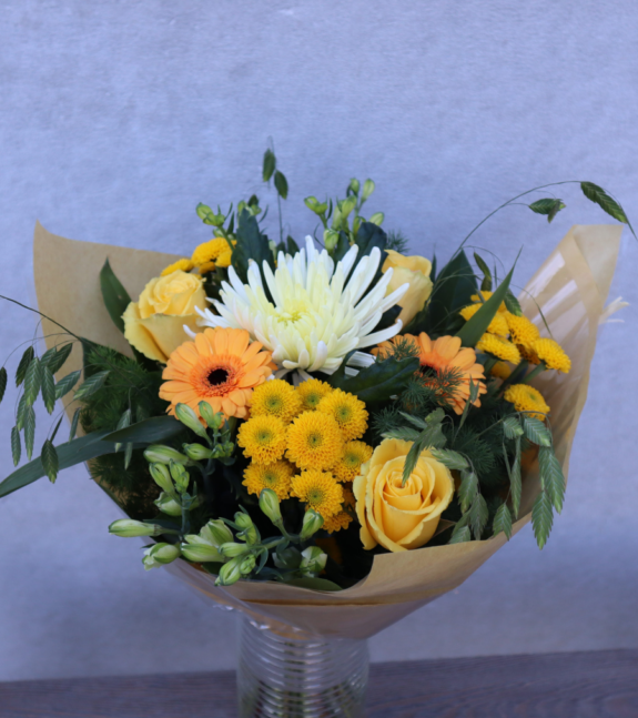 Floristen designar en bukett i gula toner med säsongens blommor. -