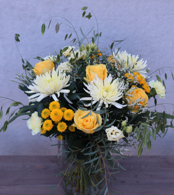 Floristen designar en bukett i gula toner med säsongens blommor.